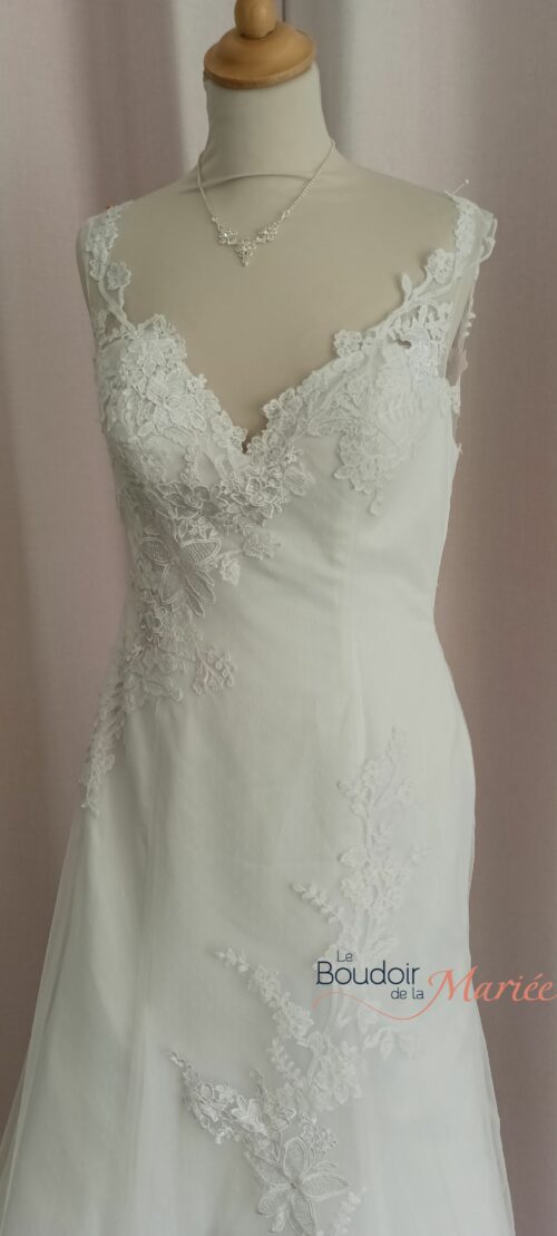 Robe blanche en tulle plumetis et appliques de dentelles.