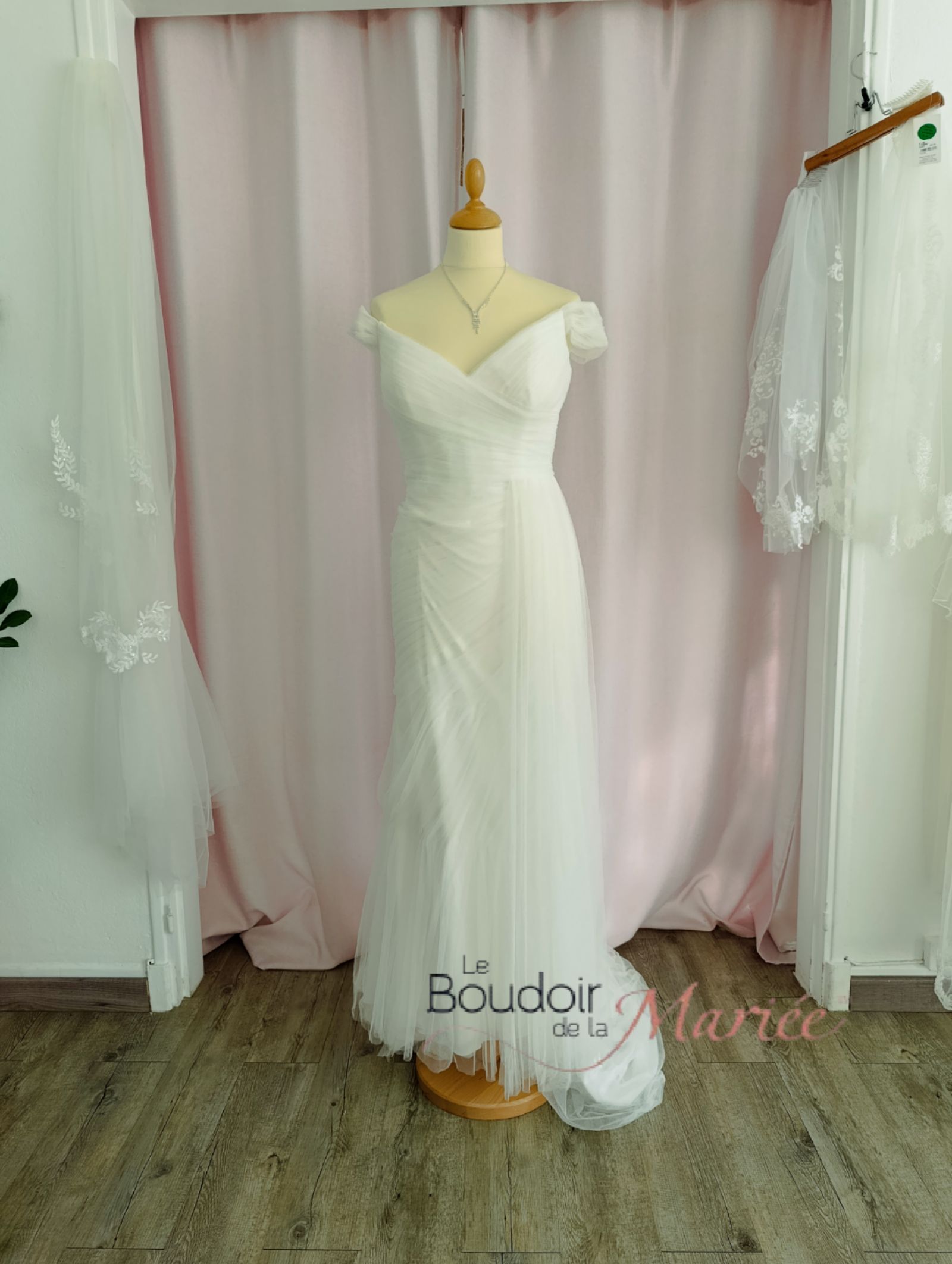Tulle drapé sur le côté et traine.