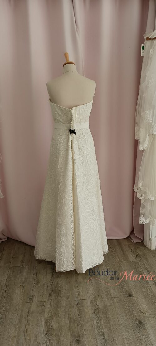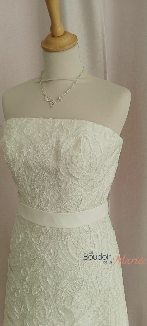 Robe bustier, ceinturée, au joli tissu recouvert de guipures (dentelles épaisses).