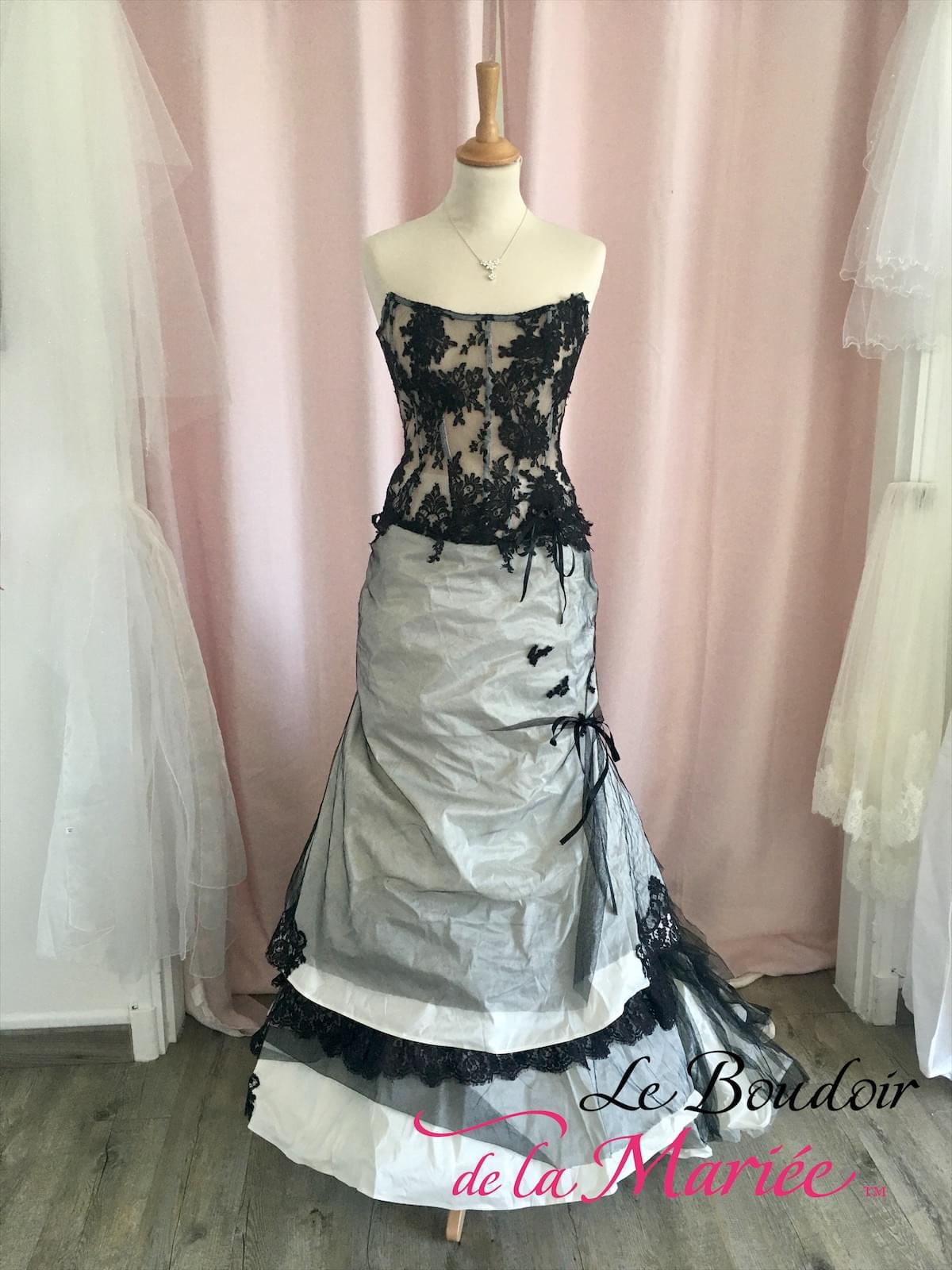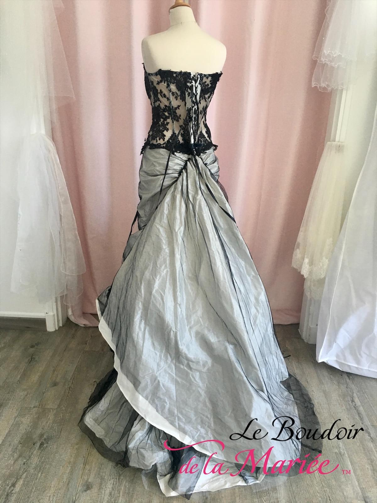Robe de mariée en taffetas ivoire recouvert d’un tulle noir.