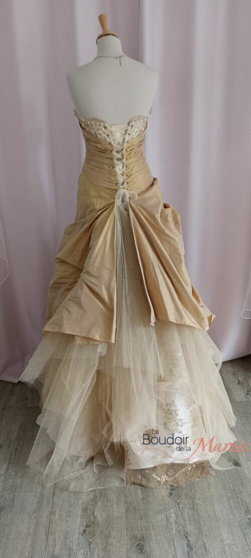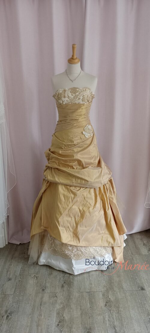 Robe de style princesse à bustier et volume moyen en soie sauvage dorée et ivoire.