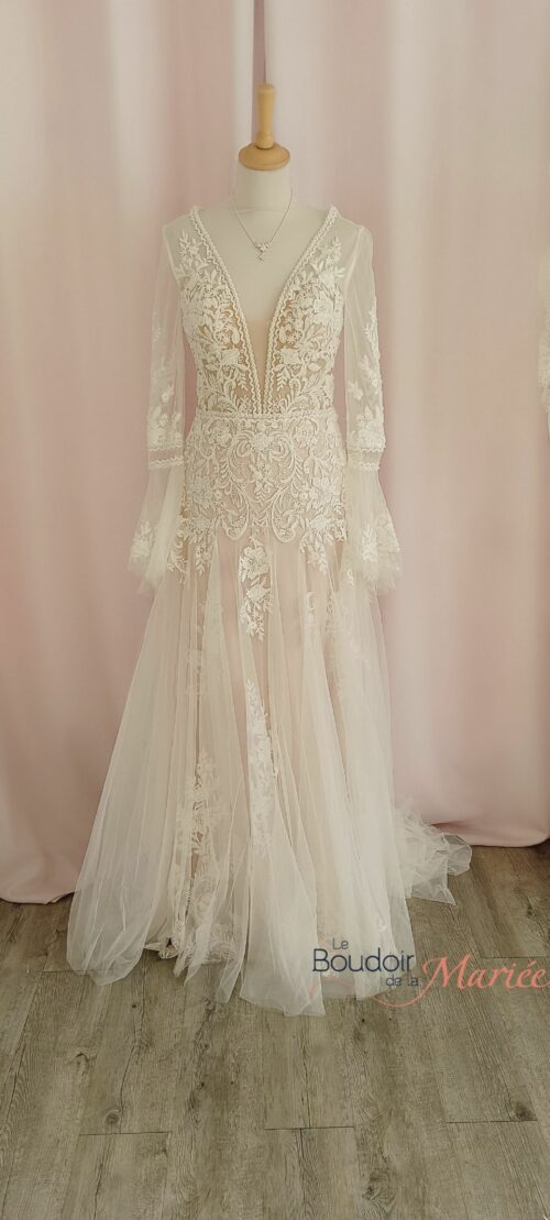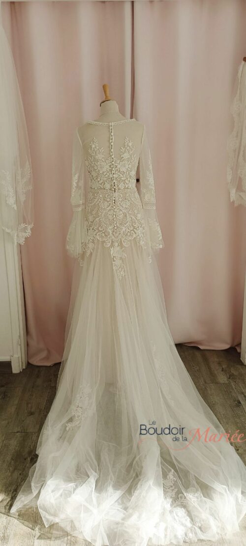 Tulle et dentelles ivoire sur un fond beige rosé.